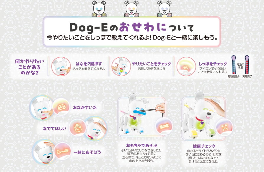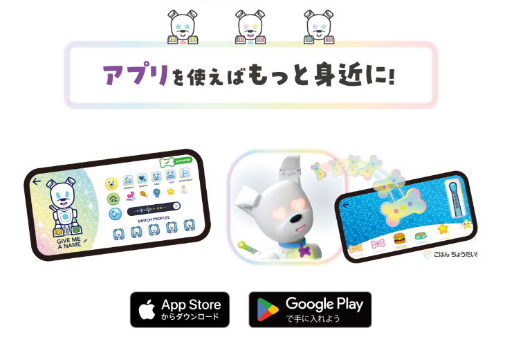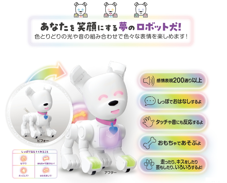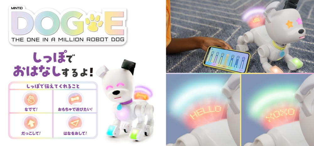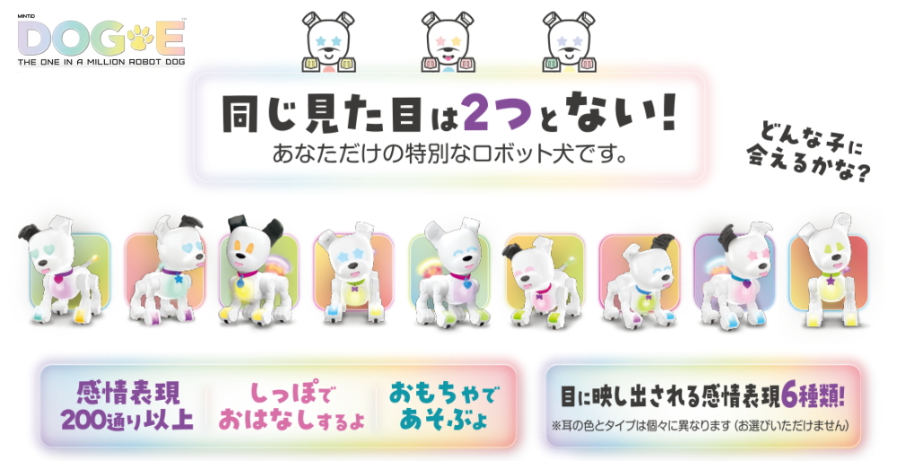 目や足の色が無限に組み合わせ可能で、あなただけの特別な犬のパートナーに。頭を撫でると感情表現し、しっぽを振って気持ちを伝えてくれます。
