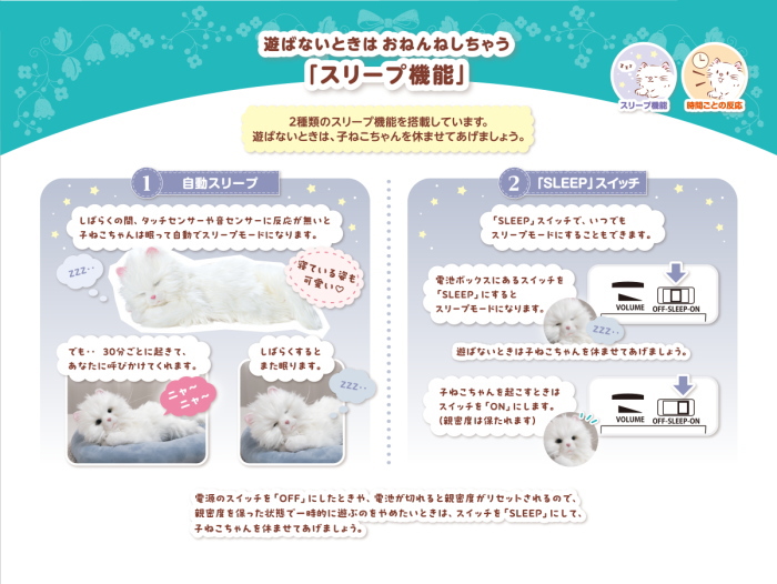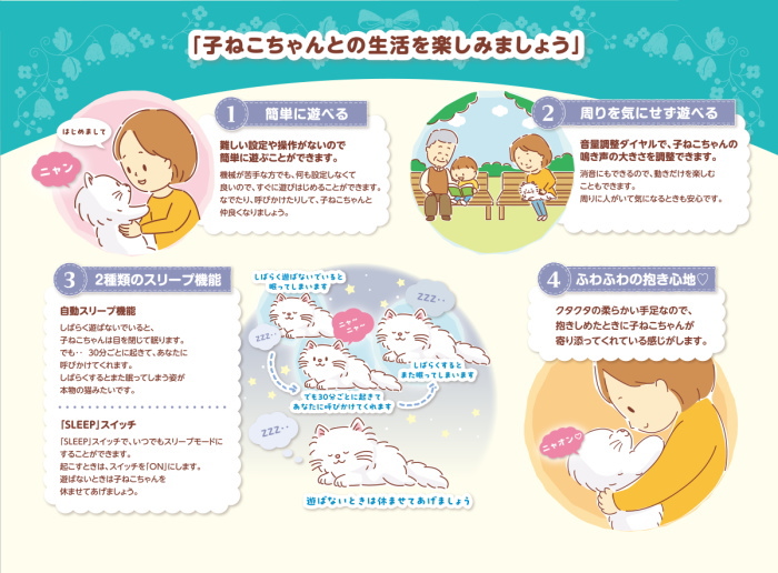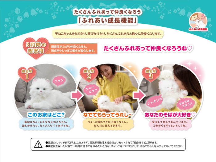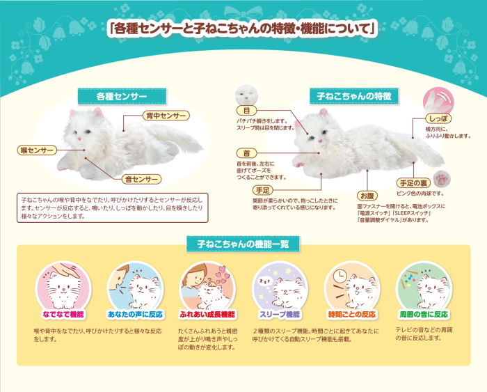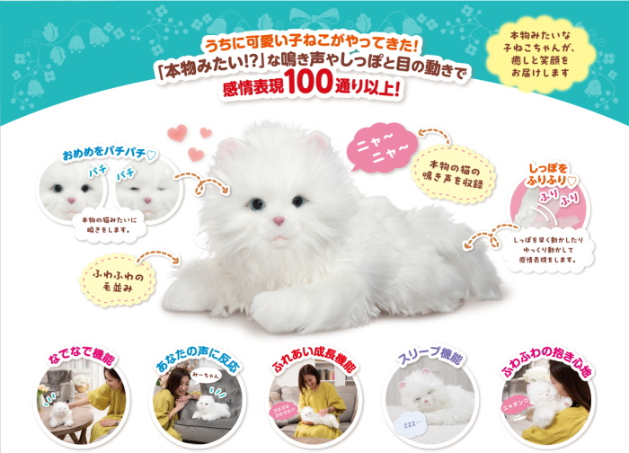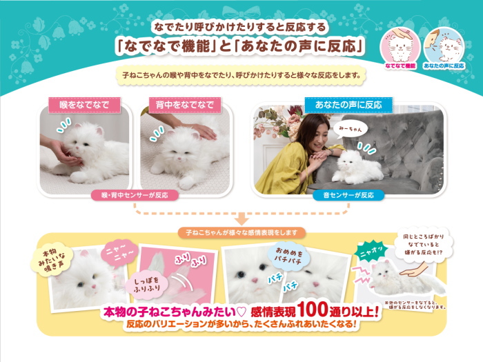 高感度センサー搭載で、なでなでや声かけに反応し、しっぽを振り目をパチパチ。感情表現は100通り以上で本物の子ネコのような鳴き声も収録。