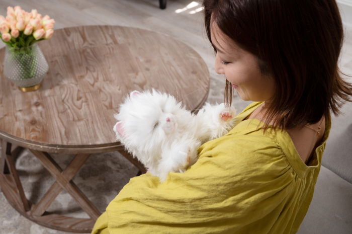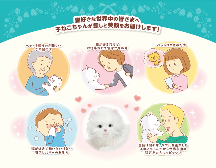 本物そっくりな白いネコの愛らしさを再現した最新型愛玩ロボットです。