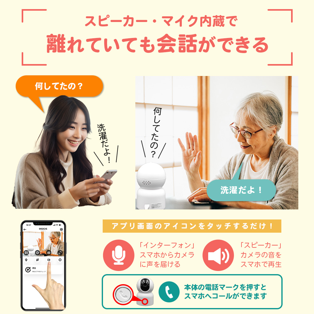 音声通話機能内蔵で離れた場所からでも安心してコミュニケーションが取れます。